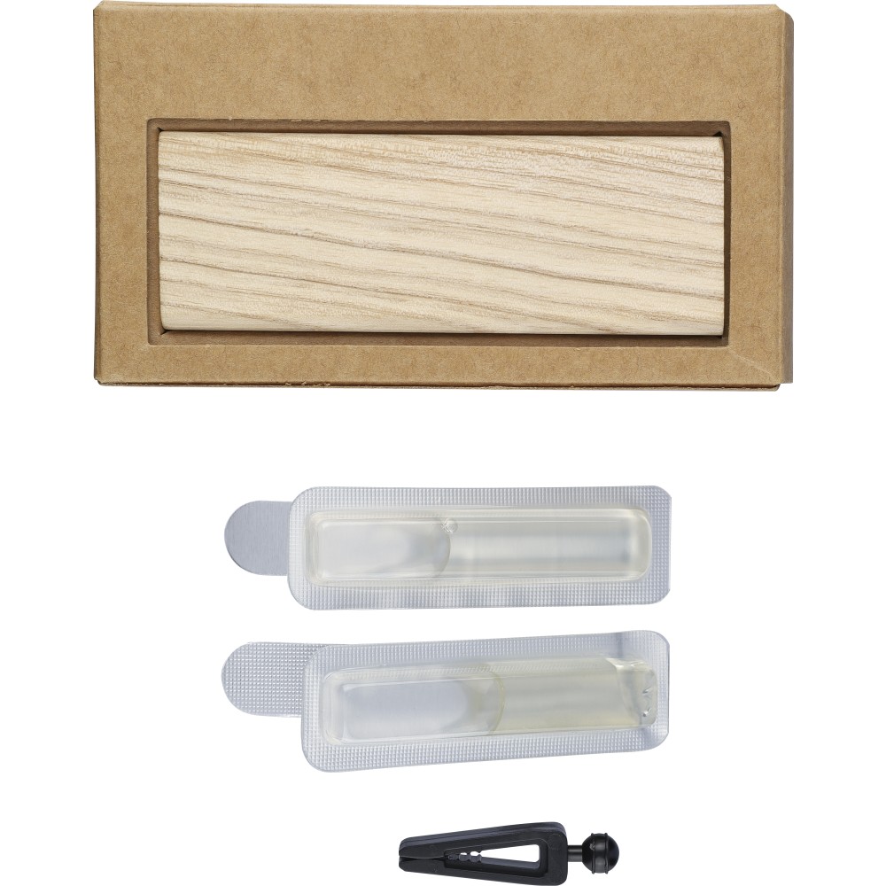 Natúr bükkfából készült autós légfrissítő, 2 × 3 g alkoholmentes szantálfa illattal (egy előre töltve, egy utántöltőként). ABS csipesszel ellátva a szellőzőrácsra történő rögzítéshez. Illusztrációval ellátott barna kartondobozba csomagolva.