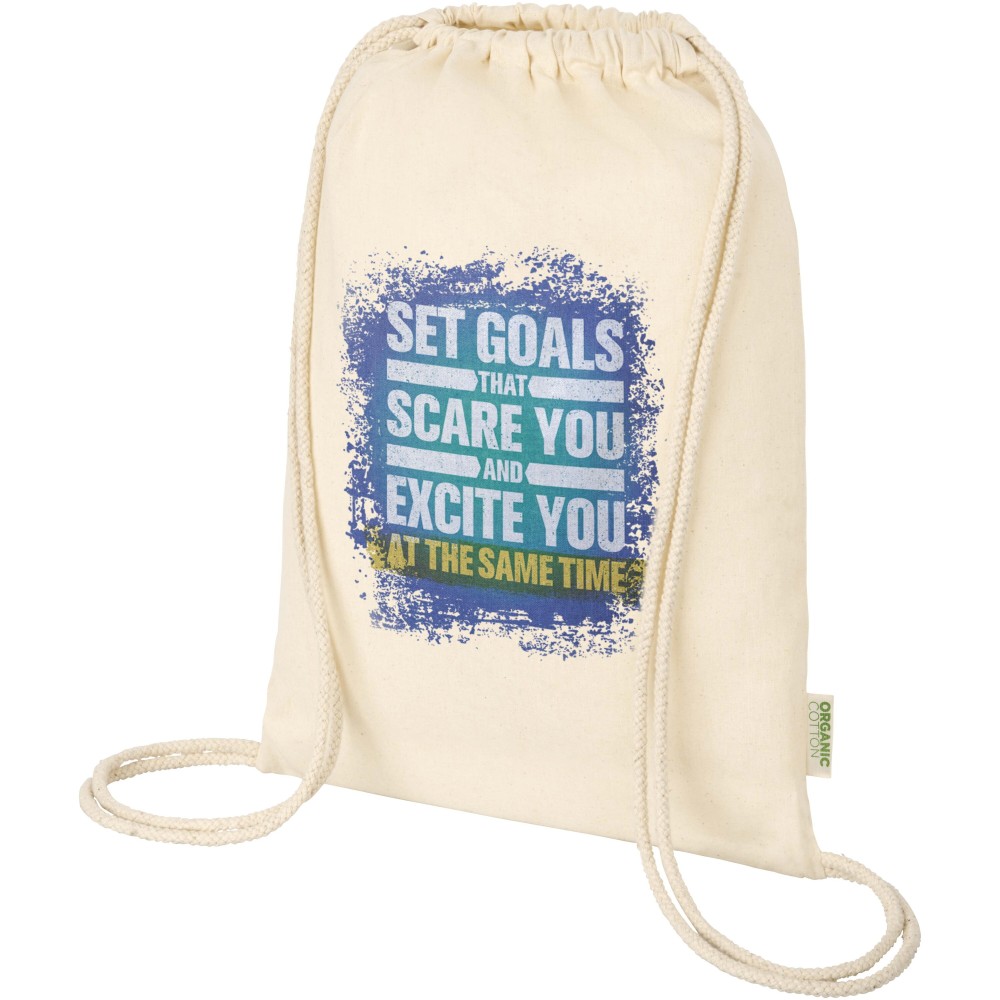 OCS tanúsítvánnyal rendelkező, 100% organikus pamutból készült húzózsinóros hátizsák környezetbarát és praktikus választás. A termék egy tágas főrekesszel és pamut zsinóros záródással rendelkezik, amely biztonságos tárolást garantál értéktárgyak számára. A táska teherbírása legfeljebb 5 kg. Űrtartalma: 5 liter. 140 g/m2 anyag.