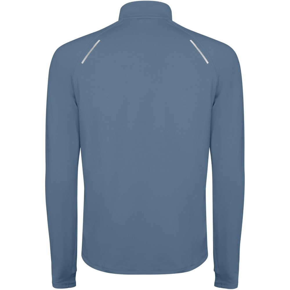 Férfi hosszúujjú technikai raglán pulóver. Gallér fordított félcipzárral, fényvisszaverő részletekkel. Erősített varrások. Mandzsetta hüvelykujj nyílással. Fényvisszaverő részletek a háton. A hátul enyhén hosszabb, mint elől. Meleg, bolyhos belső anyag.