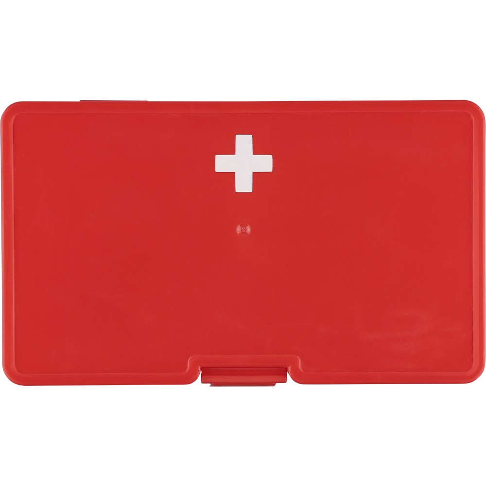PP anyagból készült elsősegélykészlet piros tokban, a felső részen fehér kereszttel és csatos záródással. Tartalma: 2 nemszőtt törlőkendő, 5 ragtapasz, 4 alkoholos törlőkendő, 1 olló, 1 tekercs 450 cm hosszú gézkötés és 1 tekercs 450 cm hosszú ragasztószalag.