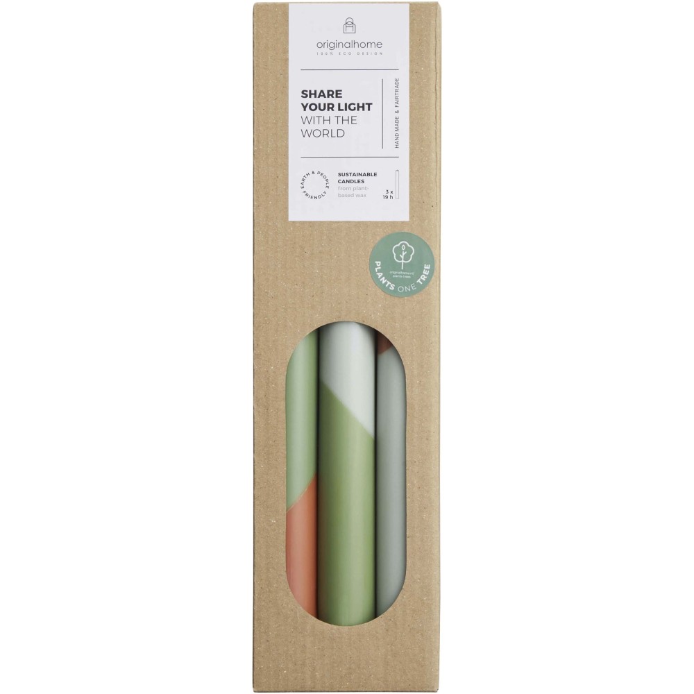 Az Eden gyertyaszett három darab élénk színösszeállítású asztali gyertyát tartalmaz, amelyek növényi alapú, paraffinmentes viaszból, kézzel készülnek. A termékek illatmentesek, 100% pamut kanóccal rendelkeznek, és tiszta égést biztosítanak, darabonként 18-20 órás égési idővel. A gyertyák megvásárlásával afrikai gazdák faültetési projektjeit, valamint egy indonéziai (Jáva) fair trade kezdeményezést támogatunk.