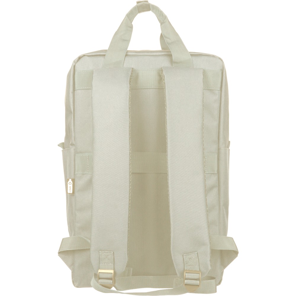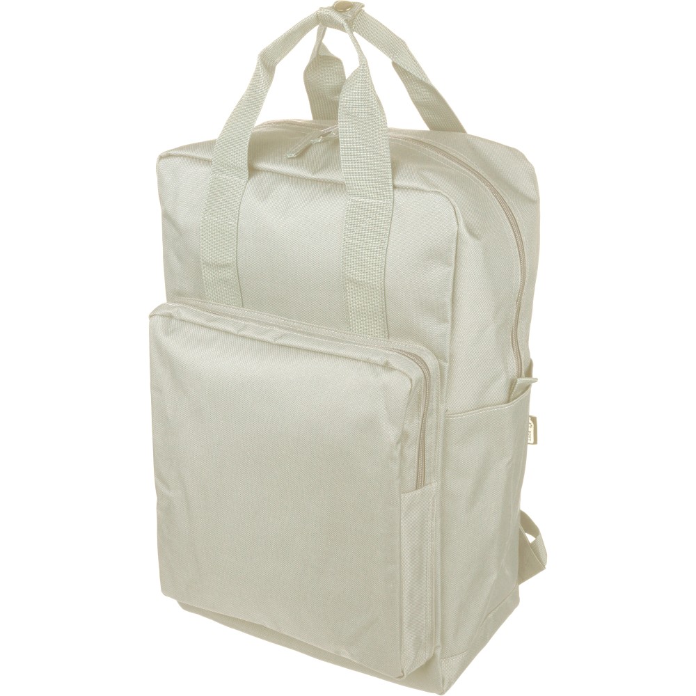 Újrahasznosított 900D poliészterből készült hátizsák, 210D béléssel és rPET címkével. Tágas fő rekesszel rendelkezik, 16?-os laptop számára kialakított külön zsebbel, elülső rekesszel, két oldalzsebbel, valamint bőröndre rögzíthető pánttal (trolley strap). Felső fogantyúi gombbal összefoghatóak, vállpántjai szellőző kialakításúak a kényelmes viselet érdekében.