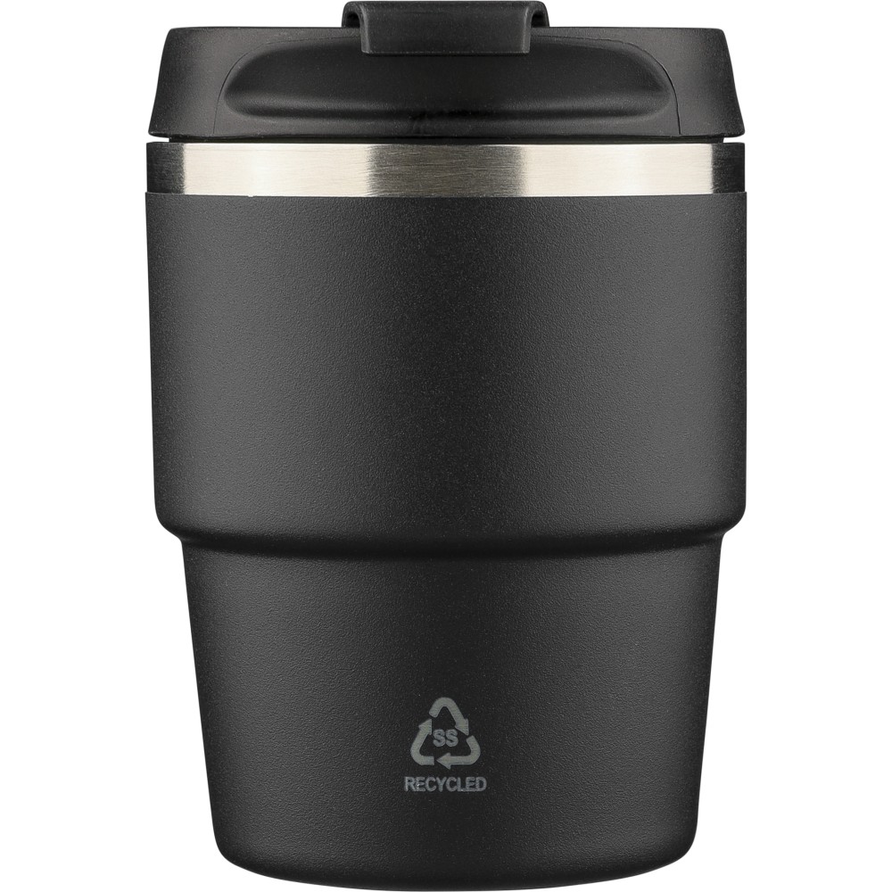 Újrahasznosított rozsdamentes acélból készült, vákuumszigetelésű bögre (175 ml) duplafalú kialakítással és porfestett felülettel, PP csavaros fedéllel. A pohártesten lézergravírozott recycled (újrahasznosított) alapanyagra utaló logó található. Kompakt kialakítása miatt a legtöbb kávégépbe illeszkedik, darabonként barna kartondobozba csomagolva szállítjuk.